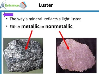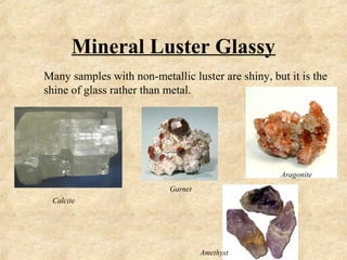 Properties Of Minerals Luster Appearance Of A Fresh Mineral Surface In Reflected Light 1 Metallic Luster 2 Vitreous Luster Glassy Luster 3 Resinous Ppt Download